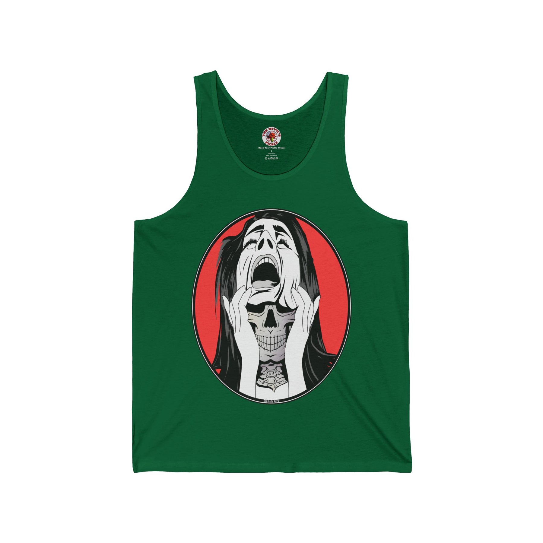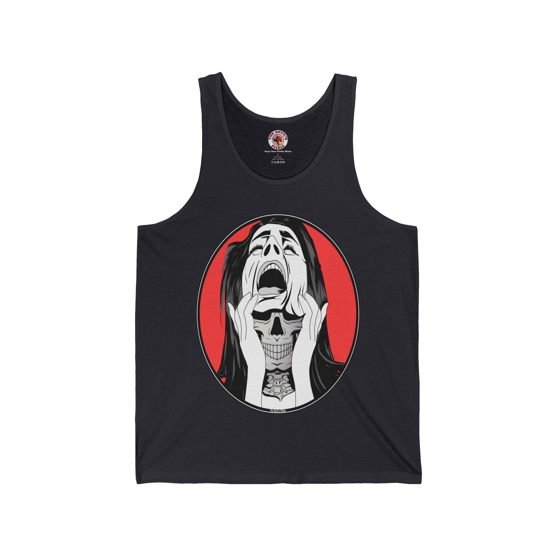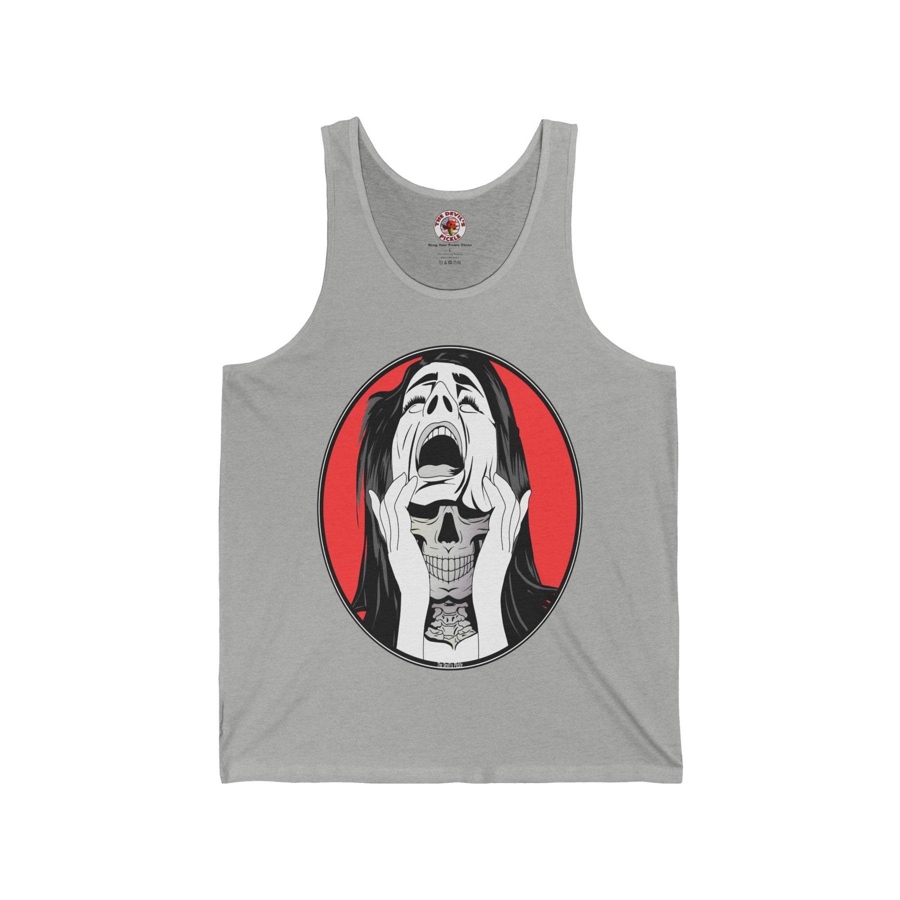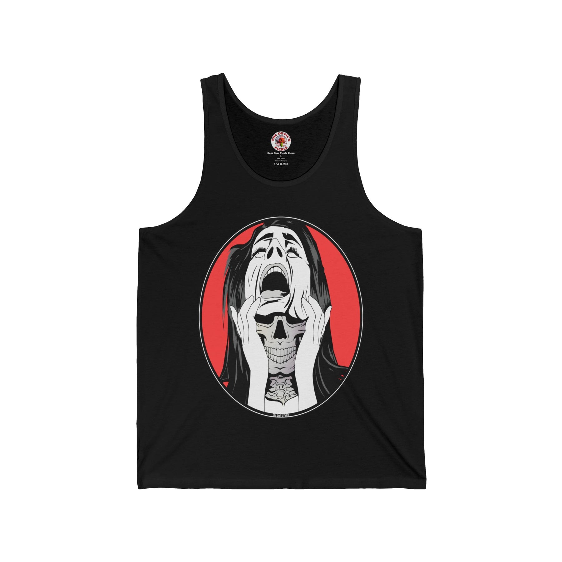Skull Woman Tank Top. Show off you creepy Halloween side with this skull woman.
