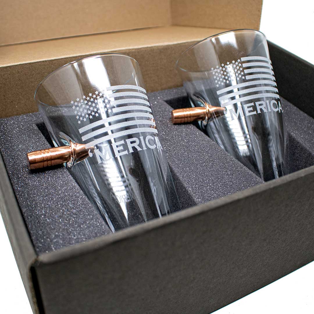 This 16oz beer pint glass is hand-embedded with a real, lead-free 0.50BMG bullet and laser etched with our best selling 'Merica design. Each bullet is CNC'd from a pure piece of copper by Lehigh Defense in Clarksville, Texas. Glasses come individually packaged in a sturdy, kraftboard display box ready for gifting.
