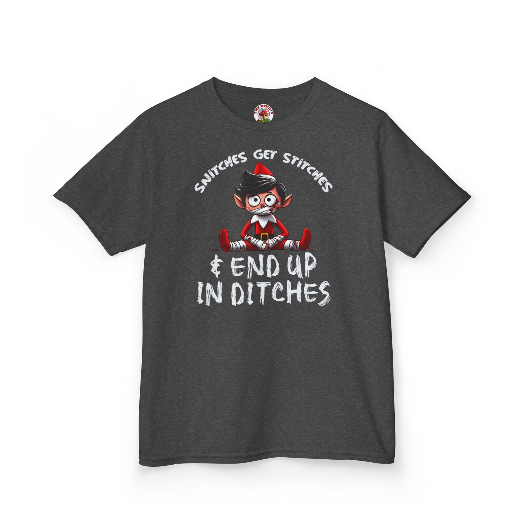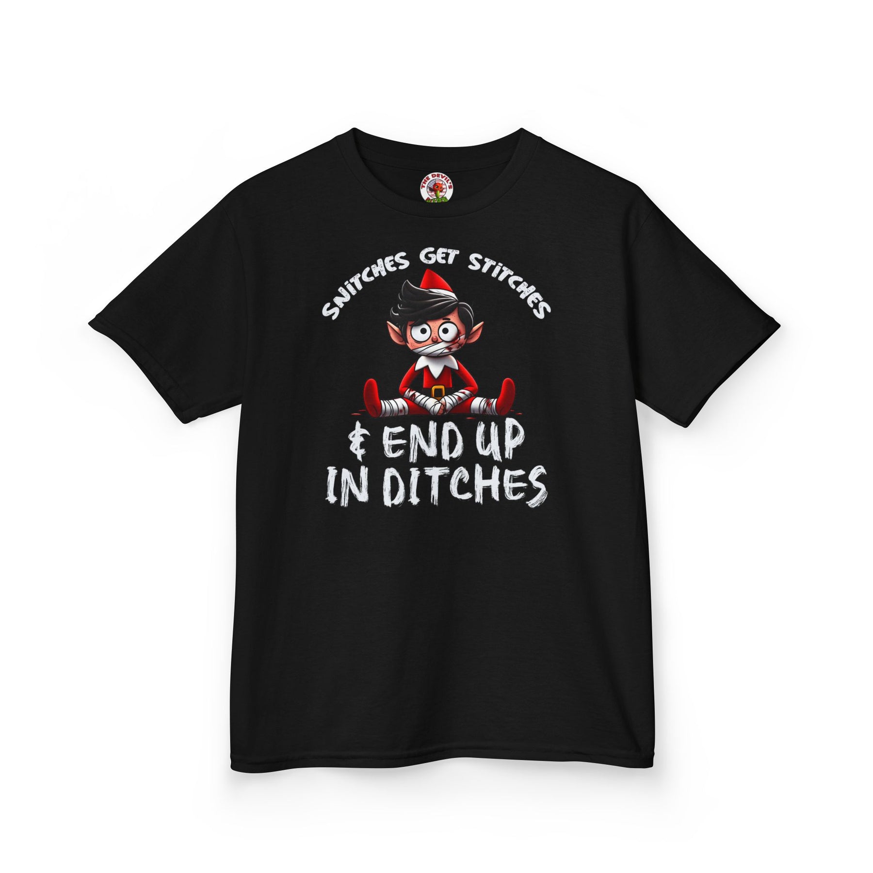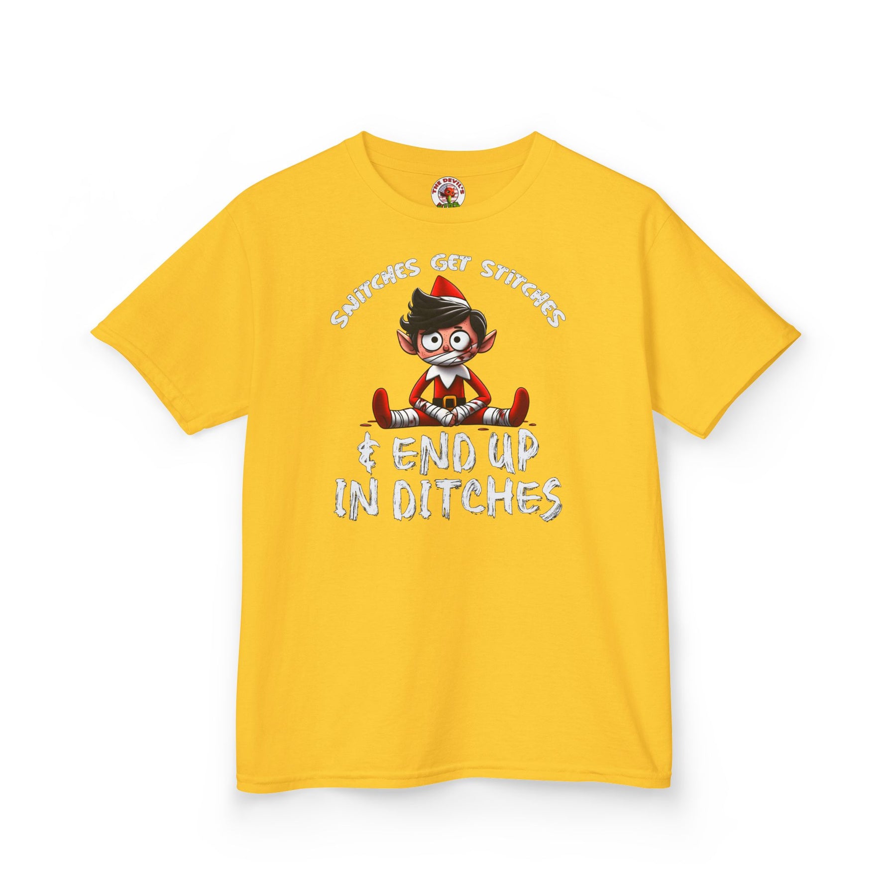 Snitches Get Stitches Kids T-Shirt. Tell everyone exactly what happens to snitches on Christmas.