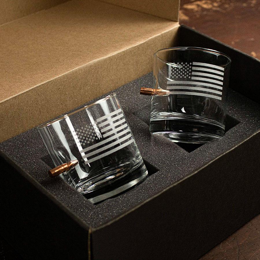 This 11oz whiskey glass is hand-embedded with a real, lead-free .308 caliber bullet and laser etched with a US Flag design. Each bullet is CNC'd from a pure piece of copper by Lehigh Defense in Clarksville, Texas. All packaging and raw materials are made in the USA. Glasses come individually packaged in a custom display box ready for gifting.